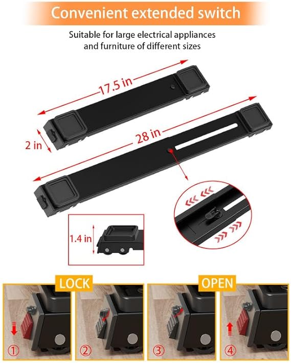 Diseño de Doble Fila y Extensible: Nuestro rodillo de electrodomésticos está diseñado para ajustarse sin complicaciones. Se extiende de 13.35 a 21.5 pulgadas, adaptándose perfectamente debajo de cualquier mueble. Ideal para refrigeradores, lavadoras, secadoras y más.
