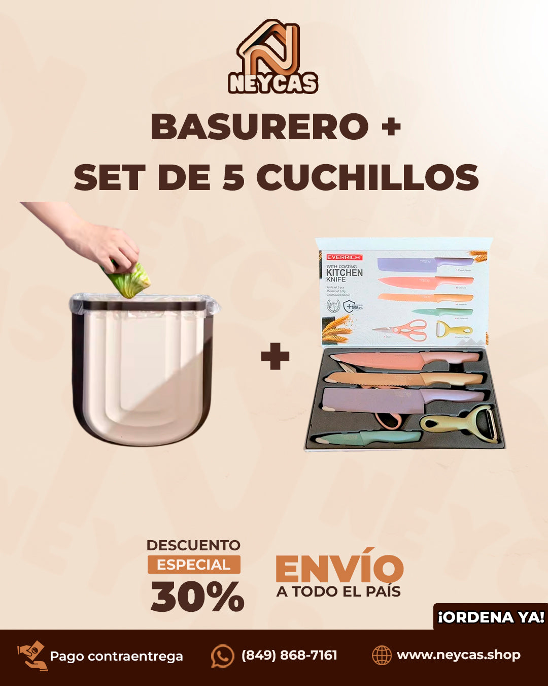 Nuestro combo incluye un práctico Basurero Plegable para Cocina, ideal para mantener tu espacio limpio, y un completo Set de Cuchillos de 5 Piezas, que hará que cortes como un chef profesional. 🔪✨