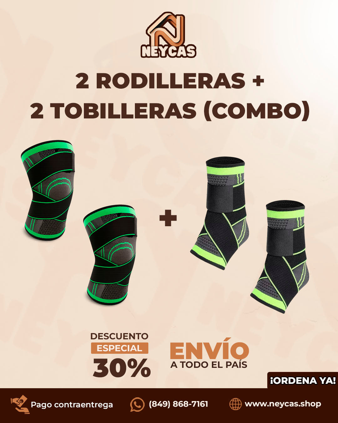 Presentamos el Combo Deportivo de Compresión: 2 Rodilleras + 2 Tobilleras. Diseñados para darte protección, soporte y alivio inmediato. Ya sea que practiques deportes intensos o busques recuperarte de una lesión, este combo será tu mejor aliado.