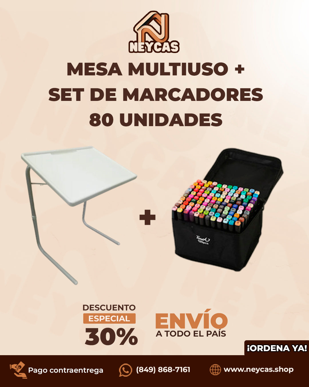 Nuestra Mesa Multiuso plegable y ajustable te permitirá adaptar tu espacio a cualquier necesidad: comer, leer, dibujar, trabajar en la laptop o simplemente relajarte. Y para los creativos, el Set de Marcadores de 80 unidades con doble punta ofrece colores vibrantes para que tus ideas cobren vida como nunca antes.