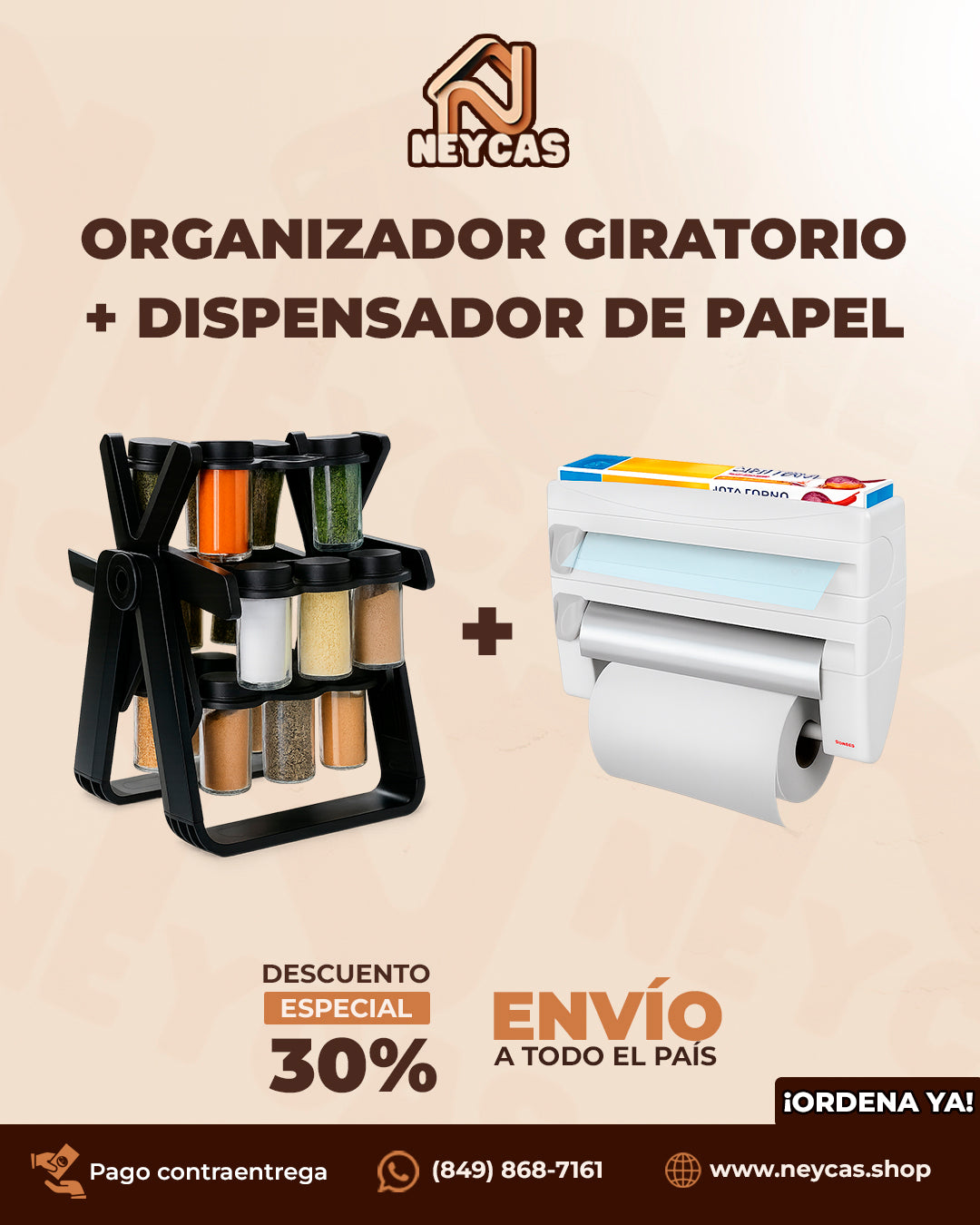 Presentamos el combo definitivo para mantener tu cocina impecable y funcional: el Organizador Giratorio de Especias con 18 Tarros + Dispensador de Papel de Cocina 4 en 1. Este dúo está diseñado para ahorrarte espacio y tiempo, mientras le da un toque elegante a tu cocina.